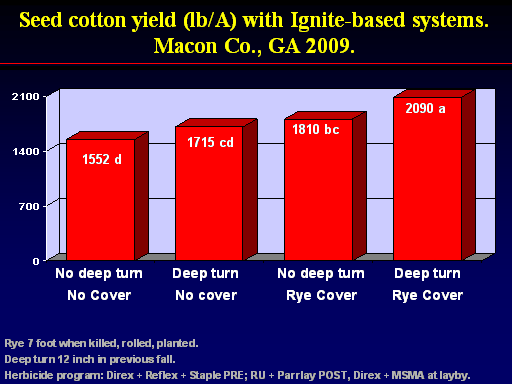 1810 bc<BR>No deep turn <BR>No Cover<BR>Deep turn <BR>No cover<BR>Rye 7 foot when killed, rolled, planted. <BR>Deep turn 12 inch in previous fall. <BR>Herbicide program: Direx + Reflex + Staple PRE; RU + Parrlay POST, Direx + MSMA at layby.<BR>1552 d<BR>1715 cd<BR>2090 a<BR>Seed cotton yield (lb/A) with Ignite-based systems. Macon Co., GA 2009.<BR>No deep turn <BR>Rye Cover<BR>Deep turn <BR>Rye Cover<BR>