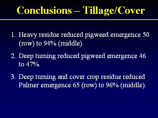 Conclusions – Tillage/Cover<BR>Heavy residue reduced pigweed emergence 50 (row) to 94% (middle). <BR>Deep turning reduced pigweed emergence 46 to 47%. <BR>Deep turning and cover crop residue reduced Palmer emergence 65 (row) to 96% (middle). <BR>