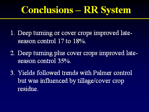 Conclusions – RR System<BR>Deep turning or cover crops improved late-season control 17 to 18%. <BR>Deep turning plus cover crops improved late-season control 35%. <BR>Yields followed trends with Palmer control but was influenced by tillage/cover crop residue. <BR>