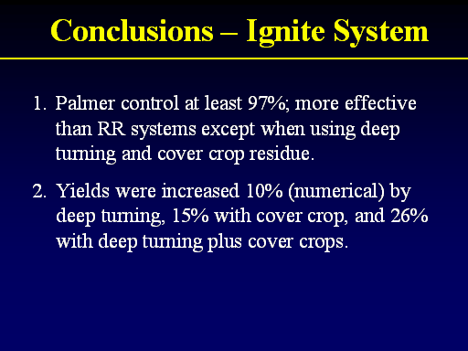 Conclusions – Ignite System<BR>Palmer control at least 97%; more effective than RR systems except when using deep turning and cover crop residue. <BR>Yields were increased 10% (numerical) by deep turning, 15% with cover crop, and 26% with deep turning plus cover crops.   <BR>