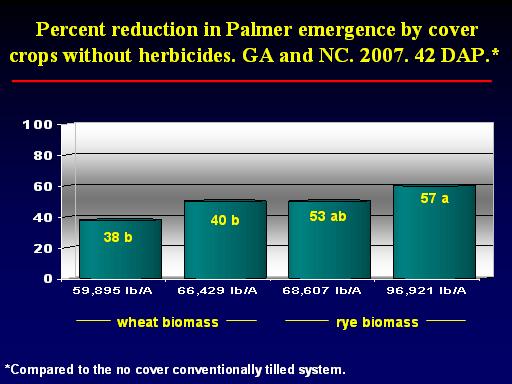 Percent reduction in Palmer emergence by cover crops without herbicides. GA and NC. 2007. 42 DAP.*<BR>*Compared to the no cover conventionally tilled system.<BR>38 b<BR>53 ab<BR>40 b<BR>57 a<BR>wheat biomass<BR>rye biomass<BR>