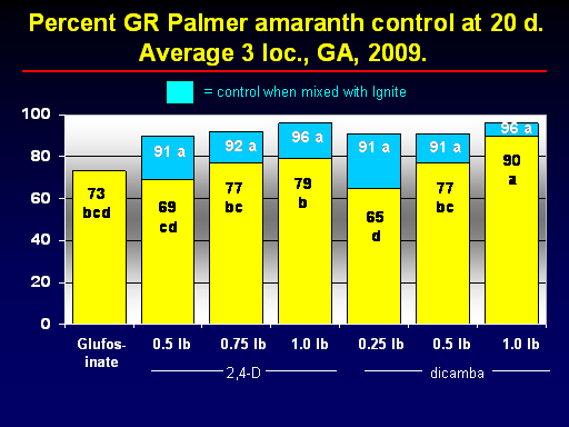 69 cd<BR>77 bc<BR>Glufos-inate<BR>0.5 lb<BR>73 bcd<BR>79 b<BR>65 d	<BR>77 bc<BR>90 a<BR>0.75 lb<BR>1.0 lb<BR>1.0 lb<BR>0.25 lb<BR>0.5 lb<BR>2,4-D<BR>dicamba<BR>91 a<BR>92 a<BR>96 a<BR>91 a<BR>91 a<BR>96 a<BR> = control when mixed with Ignite<BR> Percent GR Palmer amaranth control at 20 d.  Average 3 loc., GA, 2009.<BR>