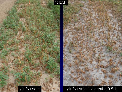 glufosinate<BR>glufosinate + dicamba 0.5 lb<BR>12 DAT<BR>