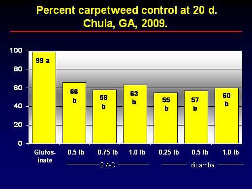 66 b<BR>58 b<BR>Glufos-inate<BR>0.5 lb<BR>99 a<BR>63 b<BR>55 b<BR>57 b<BR>60 b<BR>0.75 lb<BR>1.0 lb<BR>1.0 lb<BR>0.25 lb<BR>0.5 lb<BR>2,4-D<BR>dicamba<BR> Percent carpetweed control at 20 d.          Chula, GA, 2009.<BR>