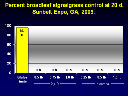 Glufos-inate<BR>0.5 lb<BR>0.75 lb<BR>1.0 lb<BR>1.0 lb<BR>0.25 lb<BR>0.5 lb<BR>2,4-D<BR>dicamba<BR> Percent broadleaf signalgrass control at 20 d.      Sunbelt Expo, GA, 2009.<BR>96 a<BR>0 b<BR>0 b<BR>0 b<BR>0 b<BR>0 b<BR>0 b<BR>