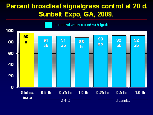 Glufos-inate<BR>0.5 lb<BR>0.75 lb<BR>1.0 lb<BR>1.0 lb<BR>0.25 lb<BR>0.5 lb<BR>2,4-D<BR>dicamba<BR>93 ab<BR>92 ab<BR> = control when mixed with Ignite<BR> Percent broadleaf signalgrass control at 20 d.      Sunbelt Expo, GA, 2009.<BR>91 ab<BR>91 ab<BR>88 b<BR>92 ab<BR>96 a<BR>