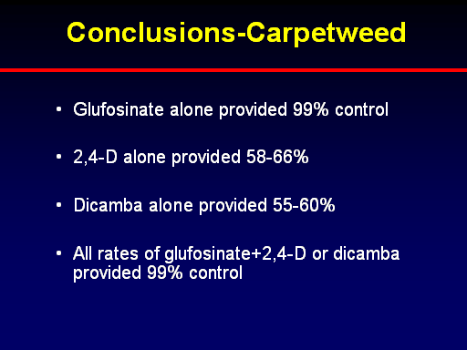 Glufosinate alone provided 99% control <BR> <BR>2,4-D alone provided 58-66% <BR> <BR>Dicamba alone provided 55-60% <BR> <BR>All rates of glufosinate+2,4-D or dicamba provided 99% control<BR>Conclusions-Carpetweed<BR>