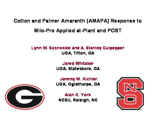 Cotton and Palmer Amaranth (AMAPA) Response to Milo-Pro Applied at-Plant and POST <BR>Lynn M. Sosnoskie and A. Stanley Culpepper <BR>UGA, Tifton, GA <BR> <BR>Jared Whitaker <BR>UGA, Statesboro, GA <BR> <BR> Jeremy M. Kichler <BR>UGA, Oglethorpe, GA <BR> <BR>Alan C. York  <BR>NCSU, Raleigh, NC <BR>