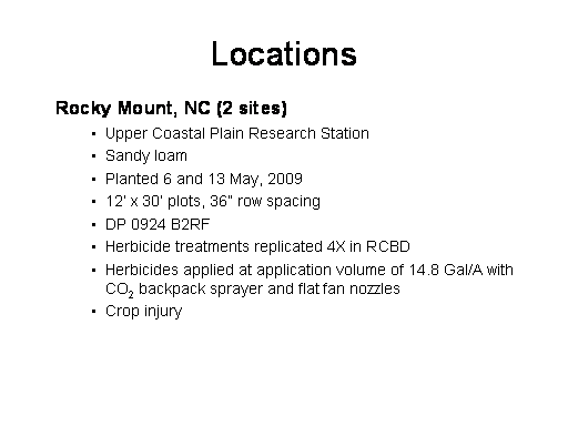Locations<BR>	Rocky Mount, NC (2 sites) <BR>Upper Coastal Plain Research Station  <BR>Sandy loam <BR>Planted 6 and 13 May, 2009 <BR>12’ x 30’ plots, 36” row spacing  <BR>DP 0924 B2RF <BR>Herbicide treatments replicated 4X in RCBD <BR>Herbicides applied at application volume of 14.8 Gal/A with CO2 backpack sprayer and flat fan nozzles <BR>Crop injury <BR>