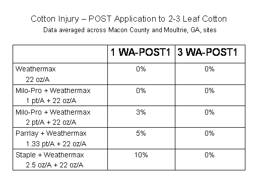 Cotton Injury – POST Application to 2-3 Leaf Cotton  Data averaged across Macon County and Moultrie, GA, sites<BR>
