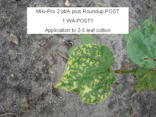 Milo-Pro 2 pt/A plus Roundup POST <BR>1 WA-POST1 <BR>Application to 2-3 leaf cotton<BR>