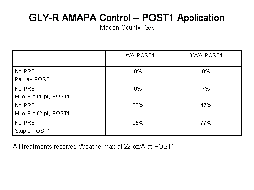 GLY-R AMAPA Control – POST1 Application Macon County, GA<BR>All treatments received Weathermax at 22 oz/A at POST1<BR>