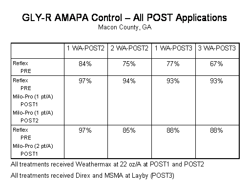GLY-R AMAPA Control – All POST Applications Macon County, GA<BR>All treatments received Weathermax at 22 oz/A at POST1 and POST2 <BR>All treatments received Direx and MSMA at Layby (POST3)<BR>