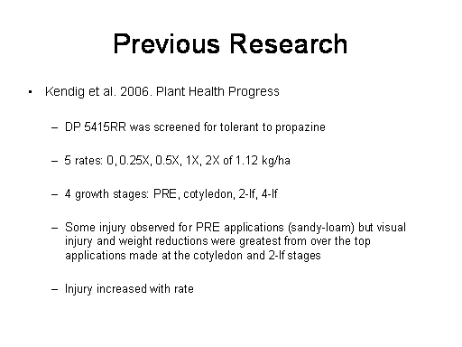 Previous Research<BR>Kendig et al. 2006. Plant Health Progress <BR> <BR>DP 5415RR was screened for tolerant to propazine <BR> <BR>5 rates: 0, 0.25X, 0.5X, 1X, 2X of 1.12 kg/ha <BR> <BR>4 growth stages: PRE, cotyledon, 2-lf, 4-lf <BR> <BR>Some injury observed for PRE applications (sandy-loam) but visual injury and weight reductions were greatest from over the top applications made at the cotyledon and 2-lf stages <BR> <BR>Injury increased with rate <BR> <BR> <BR>