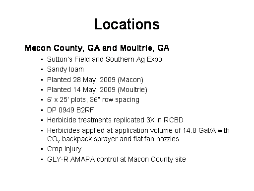 Locations<BR>	Macon County, GA and Moultrie, GA <BR>Sutton’s Field and Southern Ag Expo <BR>Sandy loam <BR>Planted 28 May, 2009 (Macon) <BR>Planted 14 May, 2009 (Moultrie) <BR>6’ x 25’ plots, 36” row spacing <BR>DP 0949 B2RF <BR>Herbicide treatments replicated 3X in RCBD <BR>Herbicides applied at application volume of 14.8 Gal/A with CO2 backpack sprayer and flat fan nozzles <BR>Crop injury  <BR>GLY-R AMAPA control at Macon County site <BR> <BR>