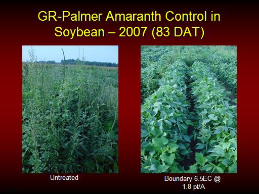 GR-Palmer Amaranth Control in Soybean – 2007 (83 DAT)<BR>Untreated<BR>Boundary 6.5EC @  <BR>1.8 pt/A<BR>SB-01-07<BR>