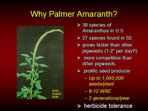 Why Palmer Amaranth?<BR>38 species of Amaranthus in U.S. <BR>27 species found in SE <BR>grows faster than other pigweeds (1-2” per day!!) <BR> more competitive than other pigweeds <BR> prolific seed producer <BR>Up to 1,000,000 seeds/plant <BR>9-12 WAE <BR>2 generations/year <BR> herbicide tolerance <BR>SWSS <BR>Weed ID <BR>Guide<BR>