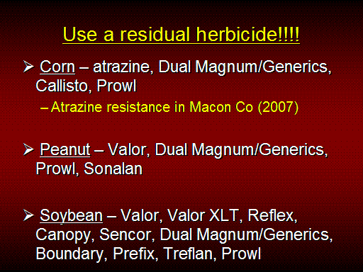 Use a residual herbicide!!!!<BR> Corn – atrazine, Dual Magnum/Generics, Callisto, Prowl <BR>Atrazine resistance in Macon Co (2007) <BR> <BR> Peanut – Valor, Dual Magnum/Generics, Prowl, Sonalan <BR> <BR> Soybean – Valor, Valor XLT, Reflex, Canopy, Sencor, Dual Magnum/Generics, Boundary, Prefix, Treflan, Prowl <BR>