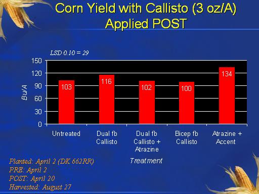 Corn Yield with Callisto (3 oz/A) Applied POST <BR>Planted: April 2 (DK 662RR)