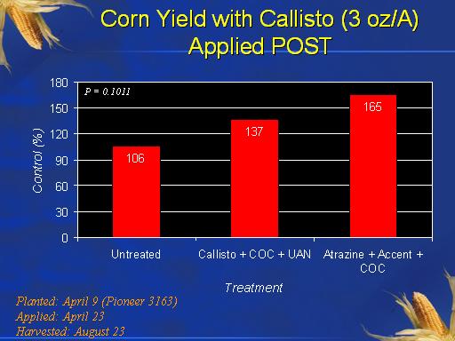 Corn Yield with Callisto (3 oz/A) Applied POST<BR>Planted: April 9 (Pioneer 3163)