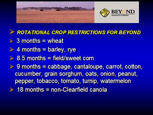 ROTATIONAL CROP RESTRICTIONS FOR BEYOND <BR> 3 months = wheat <BR> 4 months = barley, rye <BR> 8.5 months = field/sweet corn <BR> 9 months = cabbage, cantaloupe, carrot, cotton, cucumber, grain sorghum, oats, onion, peanut, pepper, tobacco, tomato, turnip, watermelon <BR> 18 months = non-Clearfield canola<BR>