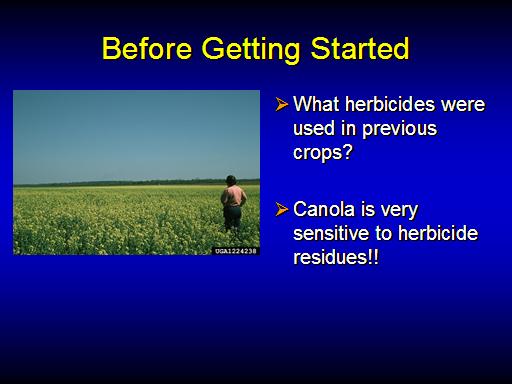 Before Getting Started<BR>What herbicides were used in previous crops? <BR> <BR>Canola is very sensitive to herbicide residues!!<BR>