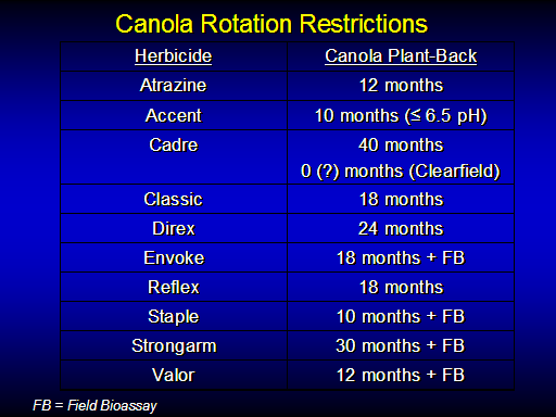 Canola Rotation Restrictions<BR>FB = Field Bioassay<BR>