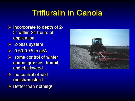 Trifluralin in Canola<BR>Incorporate to depth of 2-3” within 24 hours of application <BR> 2-pass system		 <BR> 0.50-0.75 lb ai/A <BR> some control of winter annual grasses, henbit, and chickweed <BR> no control of wild radish/mustard <BR>Better than nothing!<BR>