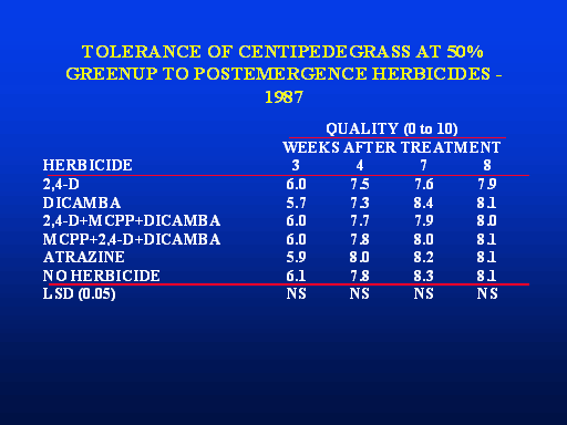 <H1>TOLERANCE OF CENTIPEDEGRASS AT 50% GREENUP TO POSTEMERGENCE HERBICIDES -1987</H1>