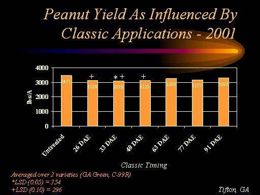 Peanut Yield As Influenced By Classic Applications - 2001<BR>Averaged over 2 varieties (GA Green, C-99R)