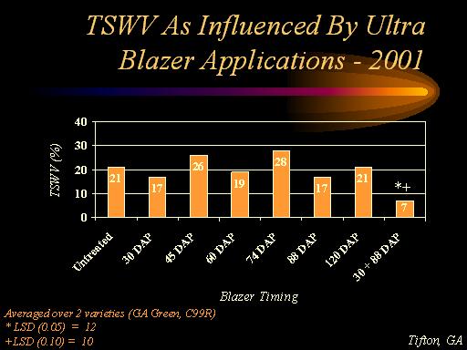TSWV As Influenced By Ultra Blazer Applications - 2001<BR>Averaged over 2 varieties (GA Green, C99R)