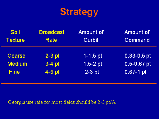 <BR>    Fine	       4-6 pt	            2-3 pt	       0.67-1 pt<BR>Georgia use rate for most fields should be 2-3 pt/A.<BR>