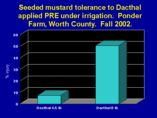 Seeded mustard tolerance to Dacthal applied PRE under irrigation.  Ponder Farm, Worth County.  Fall 2002.<BR>% injury<BR>