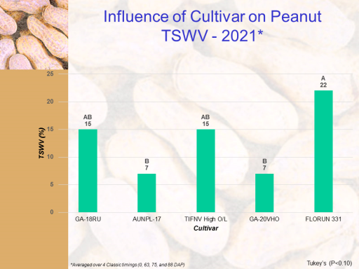Influence of Cultivar on Peanut  TSWV - 2021*<BR>*Averaged over 4 Classic timings (0, 63, 75, and 88 DAP)<BR>Tukey’s (P<0.10)<BR>