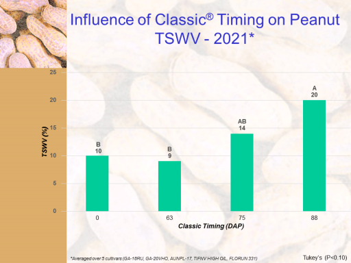 Influence of Classic® Timing on Peanut  TSWV - 2021*<BR>*Averaged over 5 cultivars (GA-18RU, GA-20VHO, AUNPL-17, TIFNV HIGH O/L, FLORUN 331)<BR>Tukey’s (P<0.10)<BR>