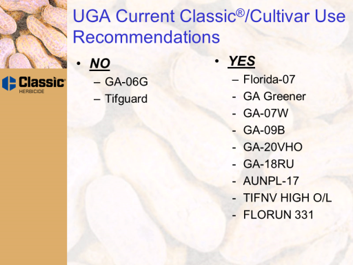 UGA Current ClassicŪ/Cultivar Use Recommendations<BR>NO <BR>GA-06G <BR>Tifguard<BR>YES <BR>Florida-07 <BR>GA Greener <BR>GA-07W <BR>GA-09B <BR>GA-20VHO <BR>GA-18RU <BR>AUNPL-17 <BR>TIFNV HIGH O/L <BR>FLORUN 331<BR>