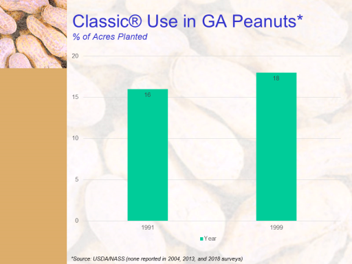 ClassicŪ Use in GA Peanuts* % of Acres Planted<BR>*Source: USDA/NASS (none reported in 2004, 2013, and 2018 surveys)<BR>