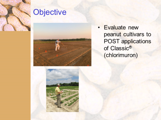 Objective<BR>Evaluate new peanut cultivars to POST applications of ClassicŪ (chlorimuron) <BR> <BR>