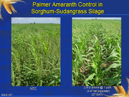 Palmer Amaranth Control in  Sorghum-Sudangrass Silage<BR>NTC<BR>2,4-D amine @ 1 pt/A <BR> (3-4” tall pigweed) <BR>(27 DAT) <BR>GS-01-07<BR>