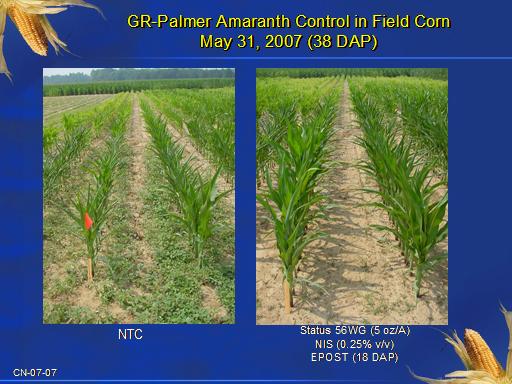 GR-Palmer Amaranth Control in Field Corn  May 31, 2007 (38 DAP)<BR>NTC<BR>Status 56WG (5 oz/A) <BR>NIS (0.25% v/v) <BR>EPOST (18 DAP)<BR>CN-07-07<BR>