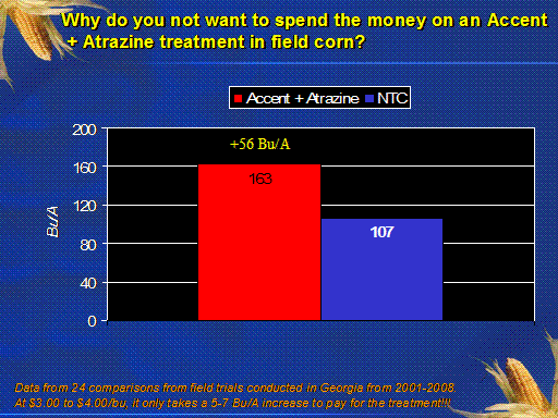Why do you not want to spend the money on an Accent  + Atrazine treatment in field corn?<BR>Data from 24 comparisons from field trials conducted in Georgia from 2001-2008. <BR>At $3.00 to $4.00/bu, it only takes a 5-7 Bu/A increase to pay for the treatment!!!<BR>+56 Bu/A<BR>