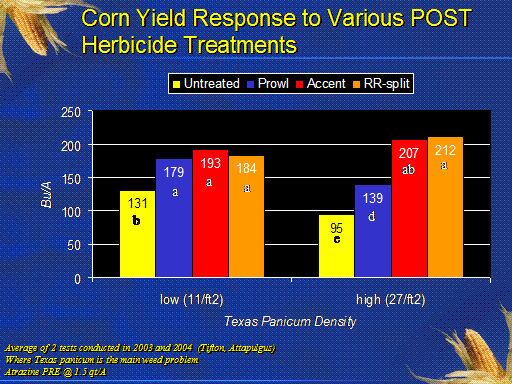 Corn Yield Response to Various POST Herbicide Treatments<BR>Average of 2 tests conducted in 2003 and 2004  (Tifton, Attapulgus) <BR>Where Texas panicum is the main weed problem <BR>Atrazine PRE @ 1.5 qt/A<BR>e<BR>d<BR>ab<BR>a<BR>b<BR>a<BR>a<BR>a<BR>