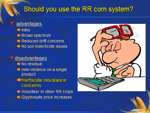 Should you use the RR corn system?<BR> advantages <BR>easy <BR>Broad spectrum <BR>Reduced drift concerns <BR>No soil insecticide issues <BR> <BR>disadvantages <BR>No residual <BR>over-reliance on a single product <BR>Herbicide resistance concerns <BR>Volunteer in other RR crops <BR>Glyphosate price increases<BR>