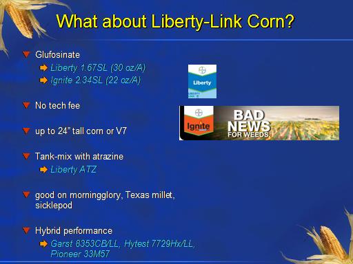 What about Liberty-Link Corn?<BR>Glufosinate <BR>Liberty 1.67SL (30 oz/A) <BR>Ignite 2.34SL (22 oz/A) <BR> <BR>No tech fee <BR> <BR>up to 24” tall corn or V7 <BR> <BR>Tank-mix with atrazine <BR>Liberty ATZ <BR> <BR>good on morningglory, Texas millet, sicklepod <BR> <BR>Hybrid performance <BR>Garst 8353CB/LL, Hytest 7729Hx/LL, Pioneer 33M57 <BR>