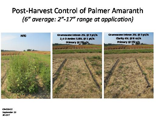 Post-Harvest Control of Palmer Amaranth (6” average: 2”-17” range at application)<BR>CN-01B-11 <BR>September 15 <BR>30 DAT<BR>NTC<BR>Gramoxone Inteon 2SL @ 3 pt/A <BR>2,4-D Amine 3.8SL @ 1 pt/A <BR>Primary @ 1% v/v<BR>Gramoxone Inteon 2SL @ 3 pt/A <BR>Clarity 4SL @ 8 oz/A <BR>Primary @ 1% v/v<BR>