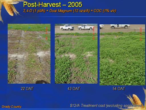 Post-Harvest – 2005 2,4-D (1 pt/A) + Dual Magnum (12 ozs/A) + COC (1% v/v) <BR>22 DAT<BR>43 DAT<BR>54 DAT<BR>*<BR>*<BR>*<BR>Grady County<BR>$12/A Treatment cost (excluding application)<BR>