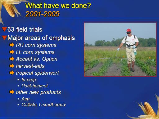What have we done? 2001-2005<BR>63 field trials <BR>Major areas of emphasis <BR> RR corn systems <BR> LL corn systems <BR> Accent vs. Option <BR> harvest-aids <BR> tropical spiderwort	 <BR>In-crop <BR>Post-harvest  <BR> other new products <BR>Aim <BR>Callisto, Lexar/Lumax <BR>