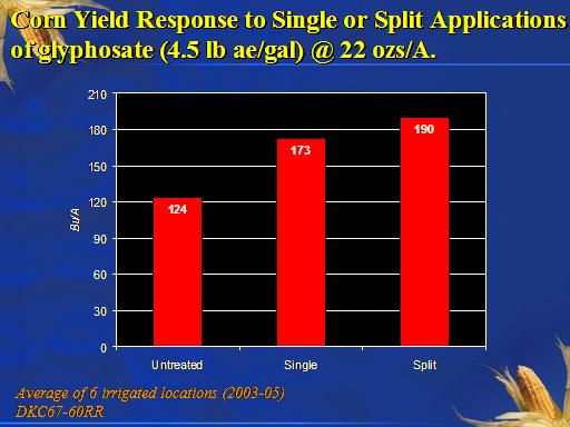 Corn Yield Response to Single or Split Applications  <BR>of glyphosate (4.5 lb ae/gal) @ 22 ozs/A.<BR>Average of 6 irrigated locations (2003-05) <BR>DKC67-60RR<BR>