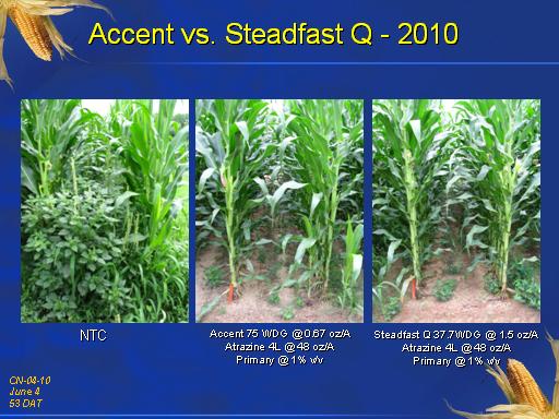 Accent vs. Steadfast Q - 2010<BR>CN-04-10 <BR>June 4 <BR>53 DAT<BR>NTC<BR>Accent 75 WDG @ 0.67 oz/A <BR>Atrazine 4L @ 48 oz/A <BR>Primary @ 1% v/v<BR>Steadfast Q 37.7WDG @ 1.5 oz/A <BR>Atrazine 4L @ 48 oz/A <BR>Primary @ 1% v/v<BR>