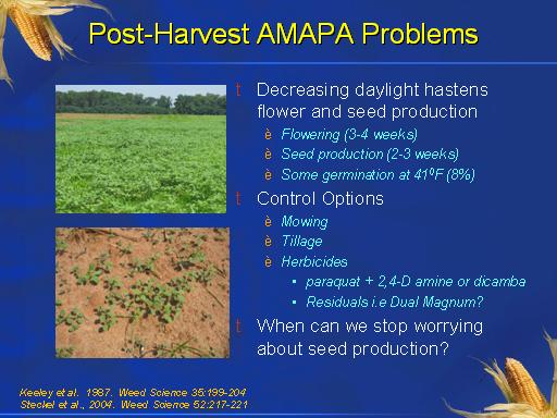 Post-Harvest AMAPA Problems<BR>Decreasing daylight hastens flower and seed production <BR>Flowering (3-4 weeks) <BR>Seed production (2-3 weeks) <BR>Some germination at 410F (8%) <BR>Control Options <BR>Mowing <BR>Tillage <BR>Herbicides <BR>paraquat + 2,4-D amine or dicamba <BR>Residuals i.e Dual Magnum? <BR>When can we stop worrying about seed production? <BR>Keeley et al.  1987.  Weed Science 35:199-204  <BR>Steckel et al., 2004.  Weed Science 52:217-221 <BR>